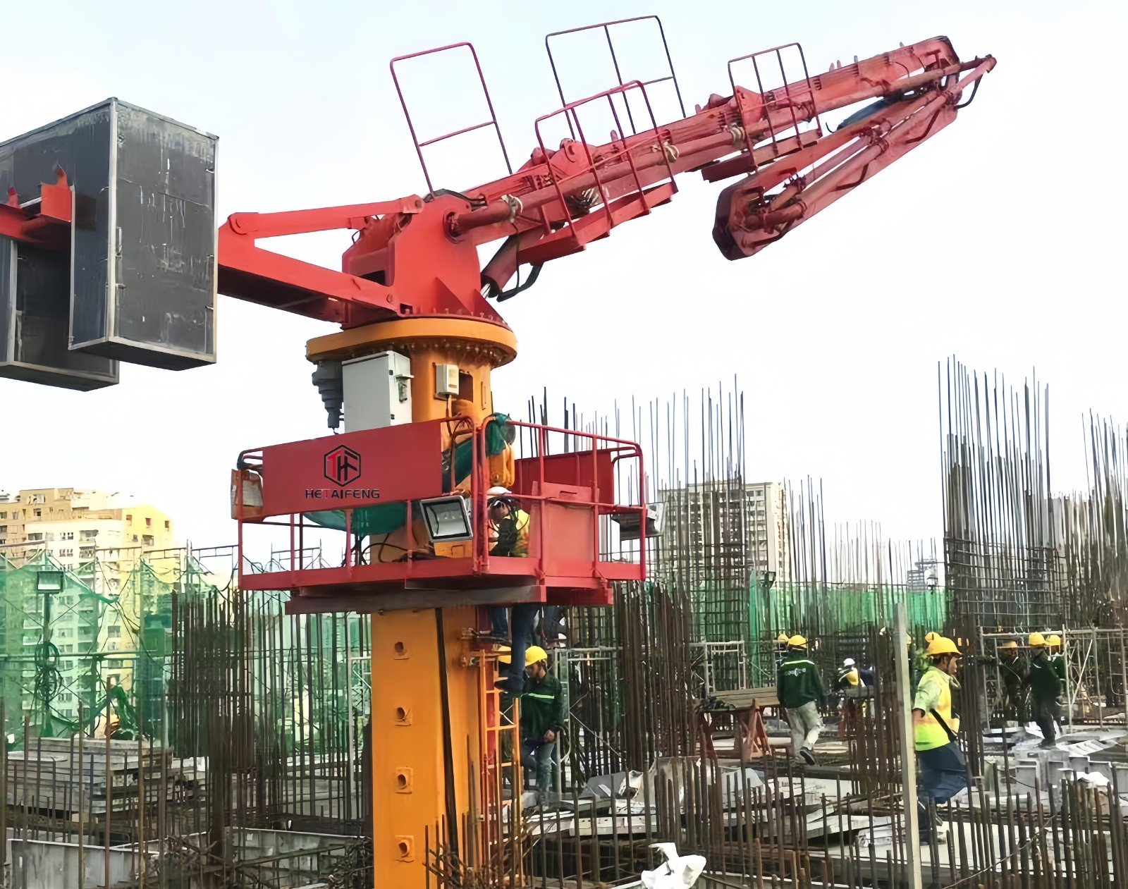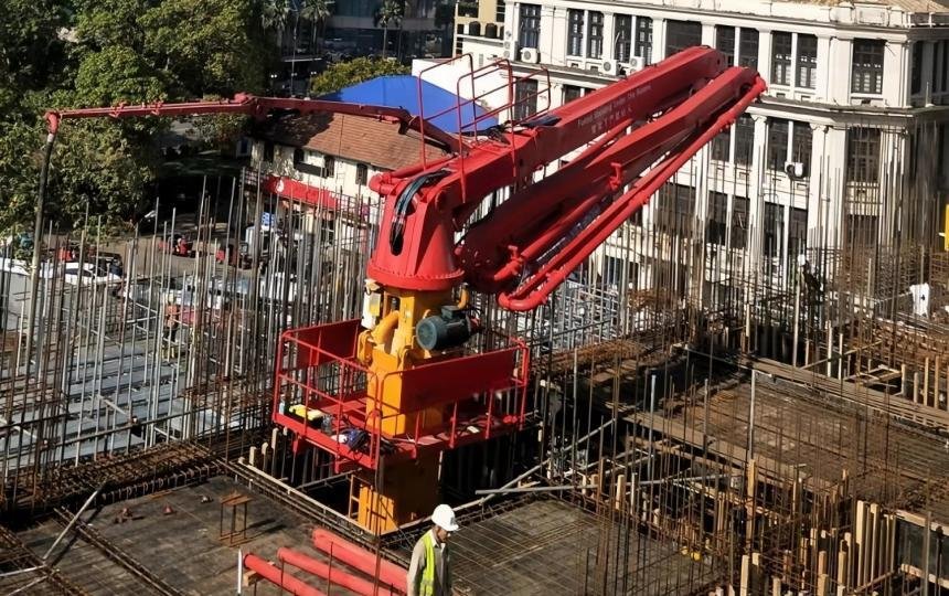 the climbing type concrete placing boom can be anchored to the floor with Initially prepared holes when working, and it can be lifted itself by its equipped climbing system, one lifting can meet the need of two floors concrete placement.